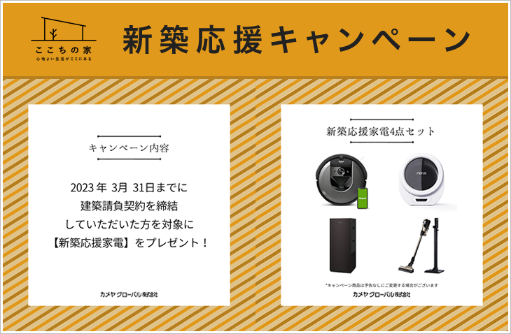 新築住宅キャンペーン 新築応援キャンペーン 2023.3.31まで終了しました キャンペーン内容 <キャンペーン期間> 2023年3月31日まで <成約特典> 2023年3月31日までに建築請負契約を締結していただいた方を対象に 【新築応援家電】をプレゼント! ※キャンペーン商品は予告なしに変更する場合がございます。 詳しくは、お問い合わせください。 お問合せ TEL. 072-436-1088