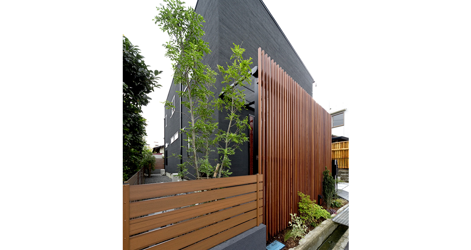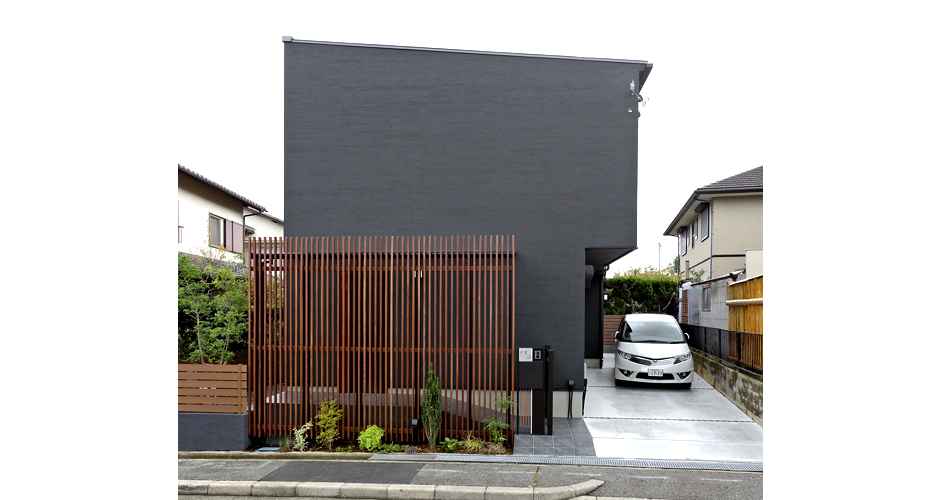 正面に窓がなく、スタイリッシュで個性的な外観。ブラックと木の格子をアクセントにするというのはお施主樣の強いこだわりでした。