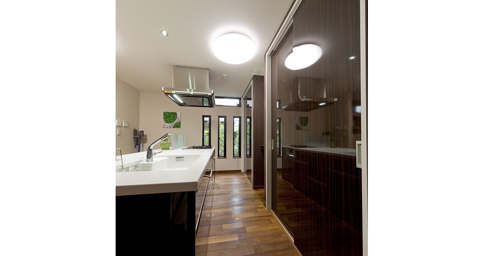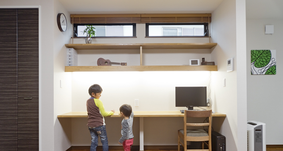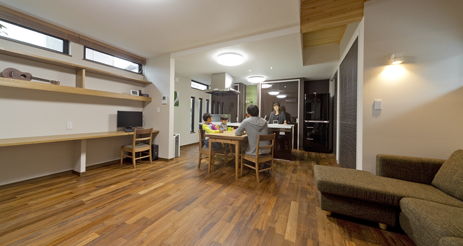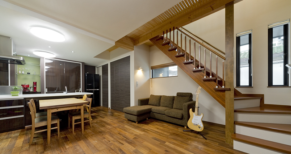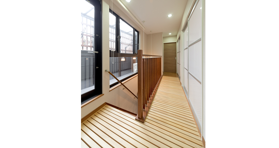 2階の廊下をすのこ仕上げにし、どんなシーンでも家族は一緒で空間のつながりを重視しました。