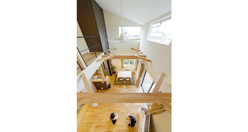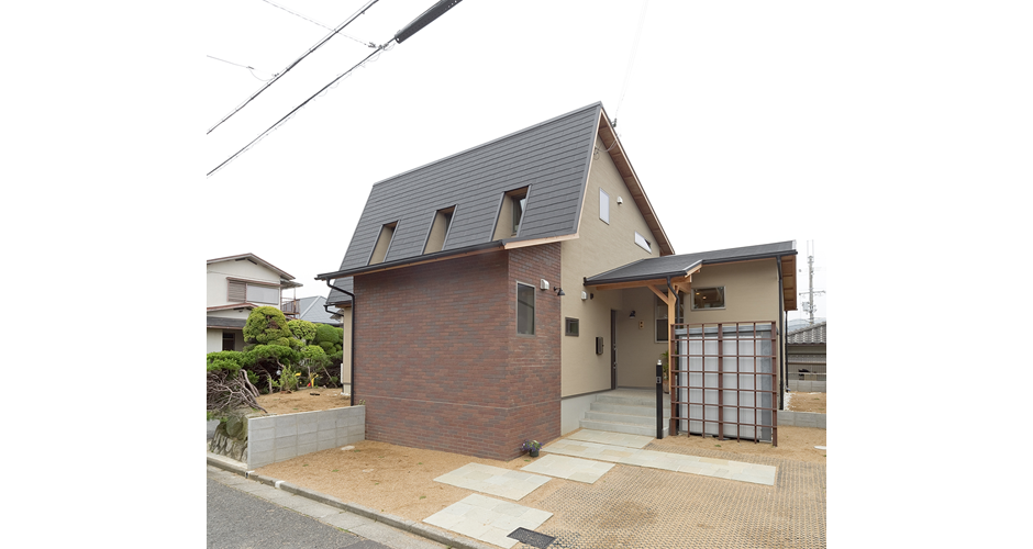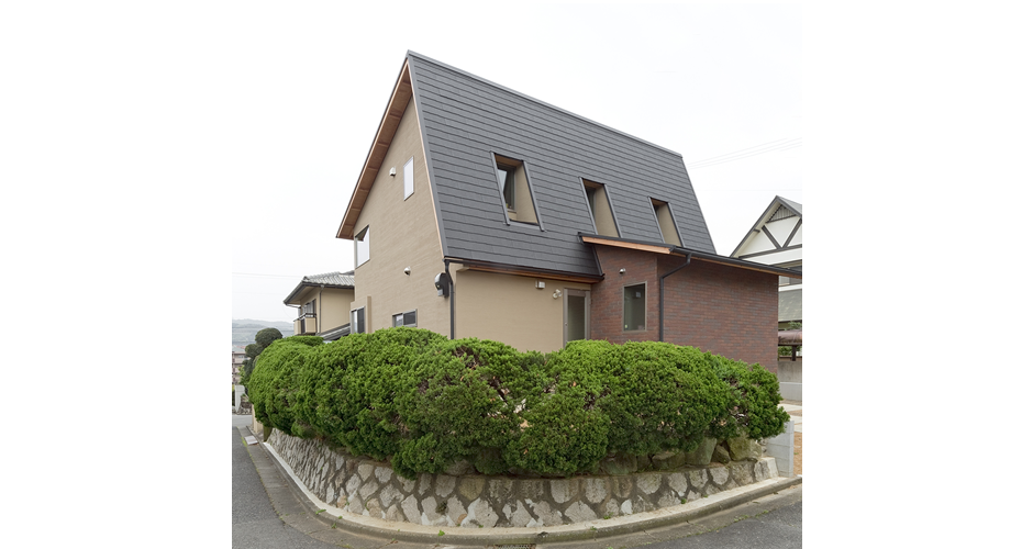 ご両親が実家を建てられ、その思いを継承し若夫婦の思いと融合させ、また町並みにも配慮した大屋根の家。南のテラスは目隠しと高低差によりプライベート性を高めています。
