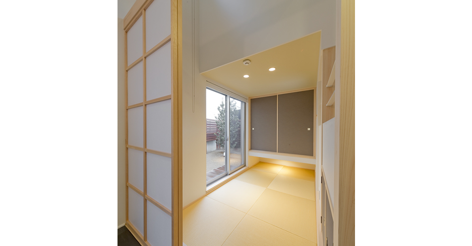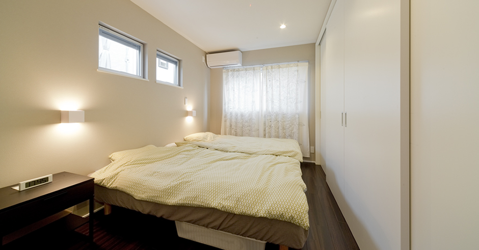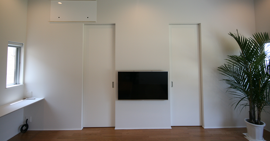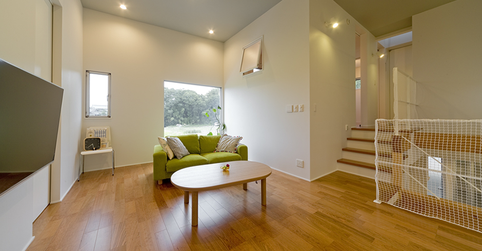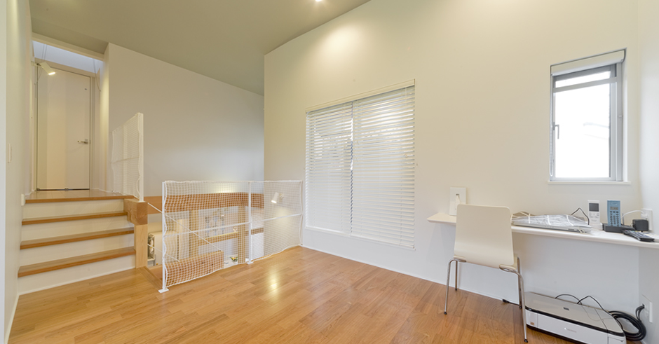 壁の小窓は子供部屋とつながる仕組みで、いつも家族がどこにいるかわかる設計にしています。