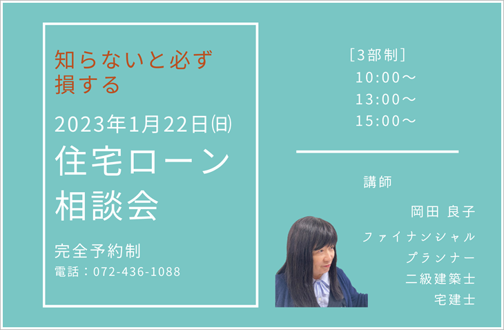 相談会 住宅ローン相談会 2023.1.22 SUN終了しました □開催場所 2階建てモデルハウス □開催時間 10:00〜/13:00〜/15:00〜 □3組限定 住宅ローンについての疑問や住宅に関する税金など、お金に関する知らないと 損することを、建築業界に30年以上携わる女性ファイナンシャルプランナーが 分かりやすく、主婦目線で解説します。 お問合せ TEL. 072-436-1088 住宅事業部まで