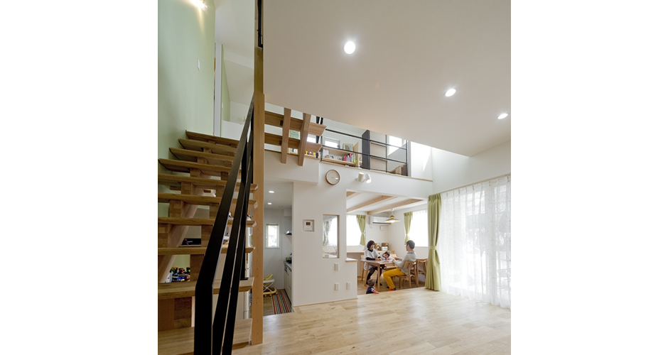 吹き抜けに面したファミリースペースは開放感抜群で、本棚やデスクを造作し勉強部屋として活用できます。