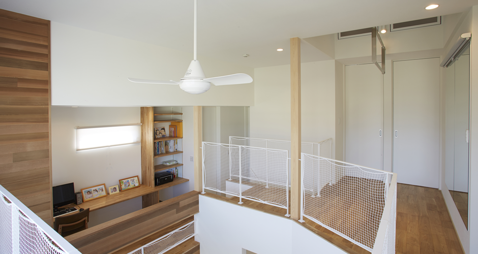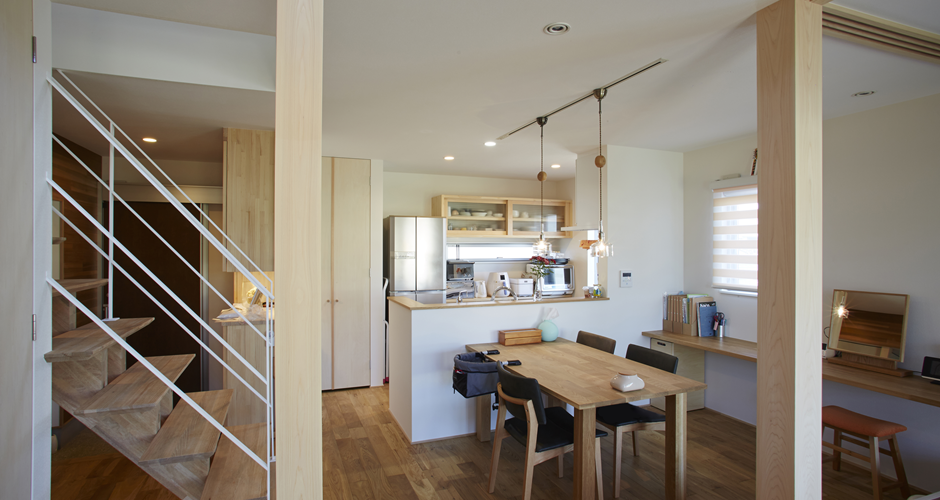 間取りは家族のつながりを重視し、どこにいても会話が成り立つ。