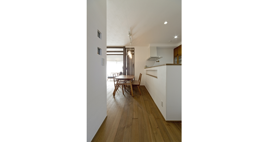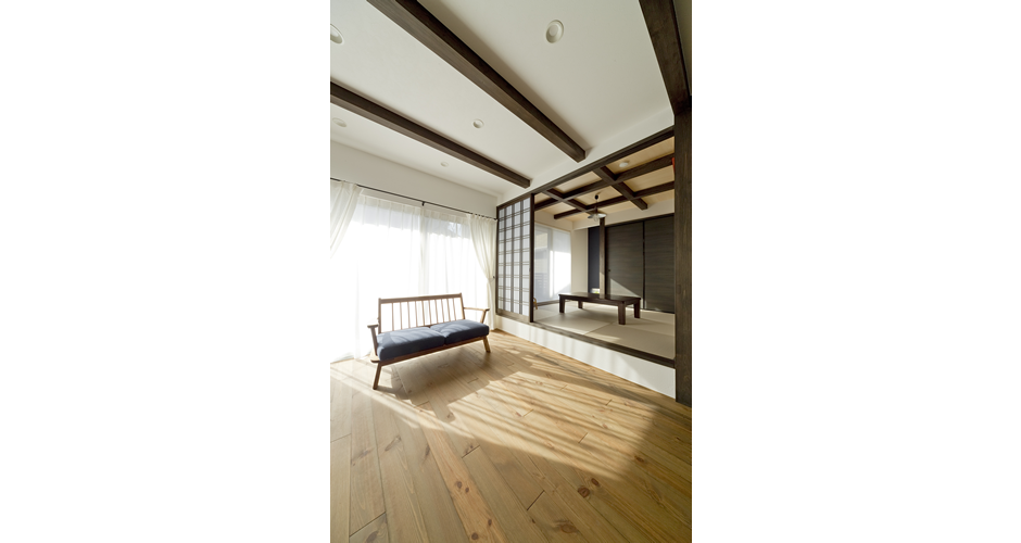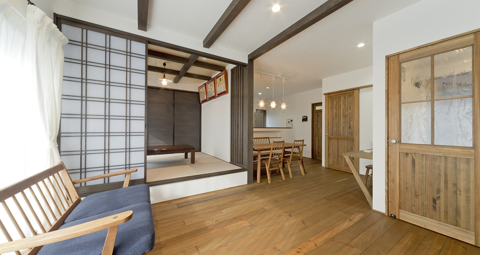 居室はもちろん、玄関からキッチン、トイレに至るまでご主人と奥様のこだわりを細部に詰め込みました。居酒屋さん風の小上がり和室、LDKの梁やキッチン廻りのタイルの大きさ、玄関の漆喰やWelcome、ドアノブなど、挙げればきりがないほどのご家族らしさが表現されたデザイン・空間に仕上がりました。
