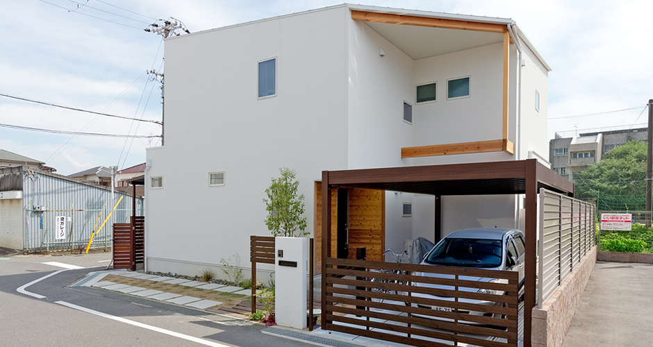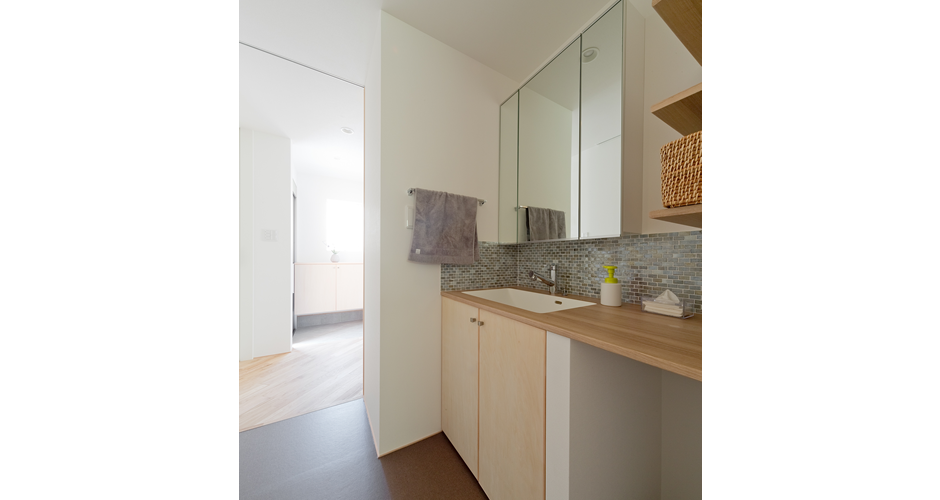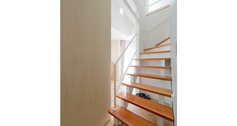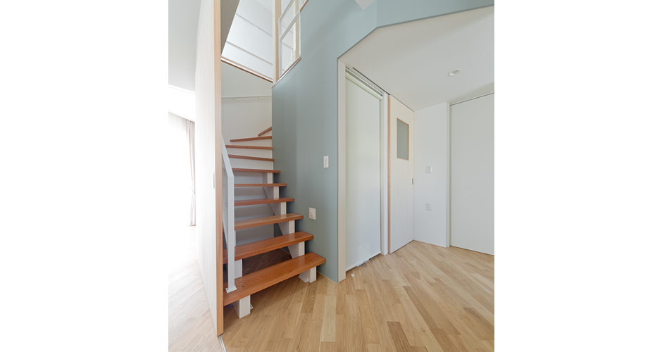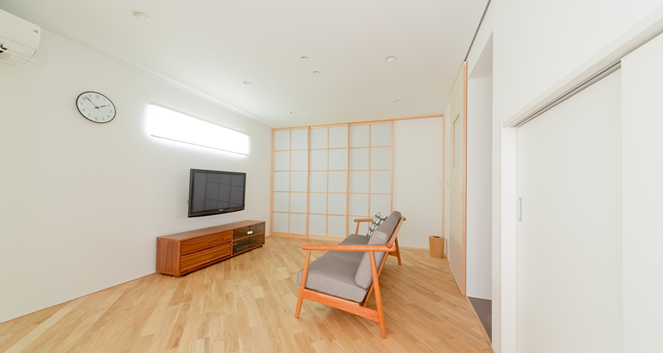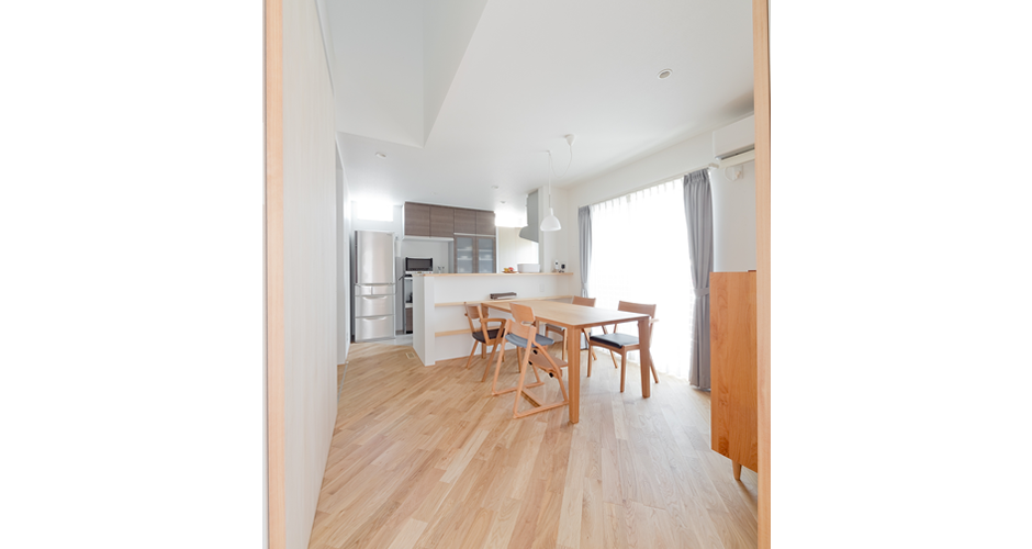 1階LDKの床に無垢のナラ材を斜めに施工。視覚効果で空間に広がりを感じます。