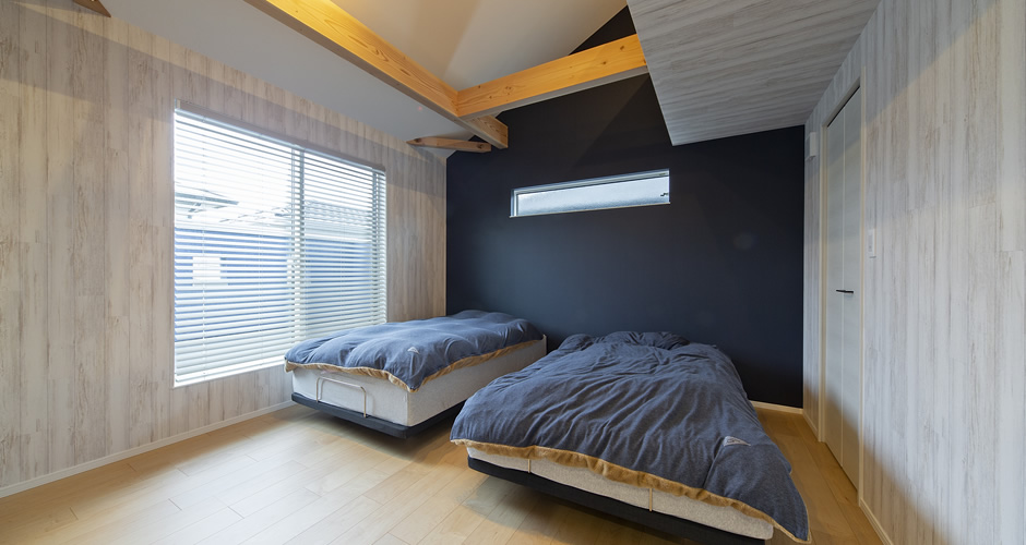 また、寝室は勾配天井により光が広がり、解放感と奥行きが生まれ、デザイン性がアップしました。