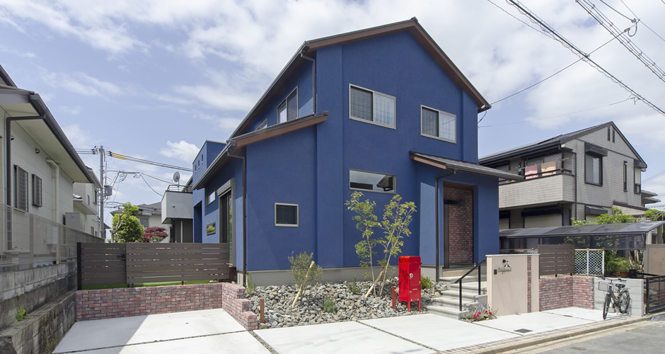 ブルーのstoとアクセントのレンガの相性はよく落ち着いた外観となっています。
