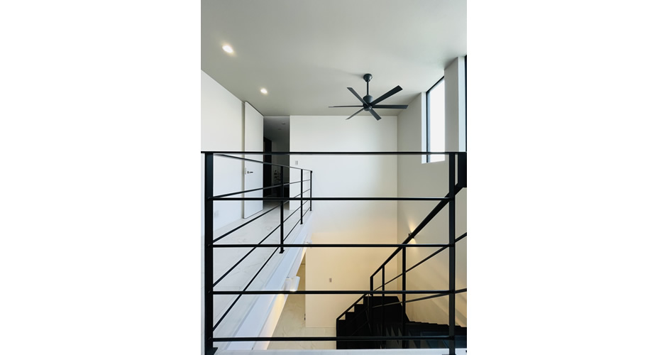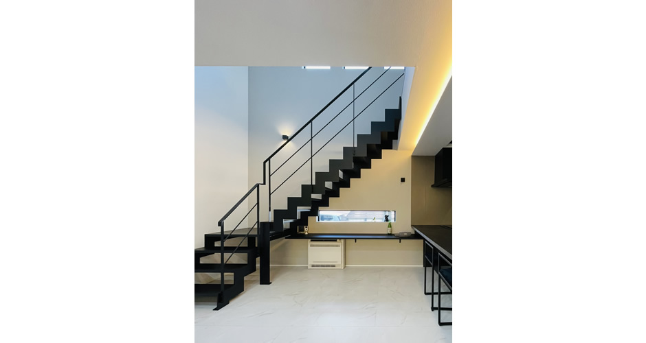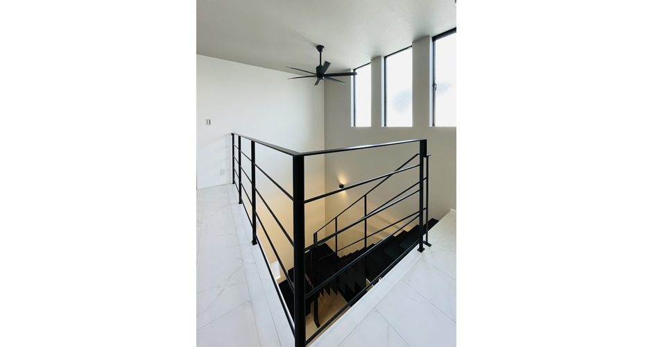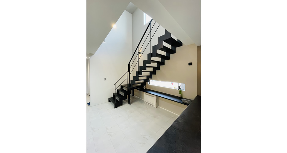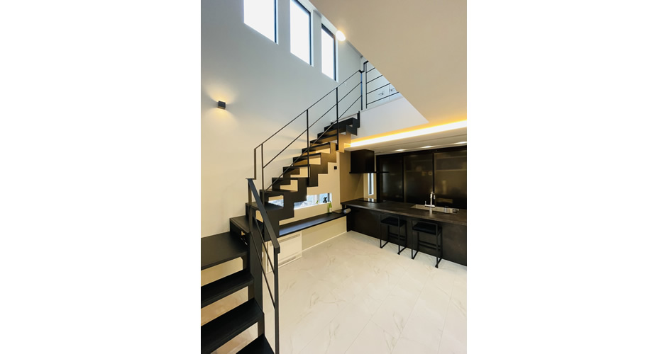 それを実現させる大きな吹き抜けに配置したアイアン製のスケルトン階段。