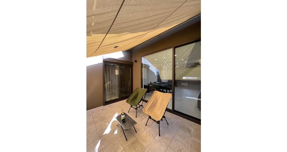 南面のタイルテラスは週末の余暇を楽しむアウトドアリビングとして大活躍しています。